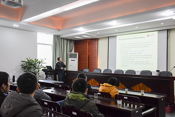 2018年12月28日上午10点,澳大利亚麦考瑞大学计算机系教授王岩受邀于逸夫楼201会议室作了以“ReputationPro: The Efficient Approaches to Contextual Transaction Trust Computation in E-Commerce Environments”为题的精彩学术报告。公司部分教师和员工参加本次讲座。讲座由公司副经理周栋及软件工程系主任唐兵主持。