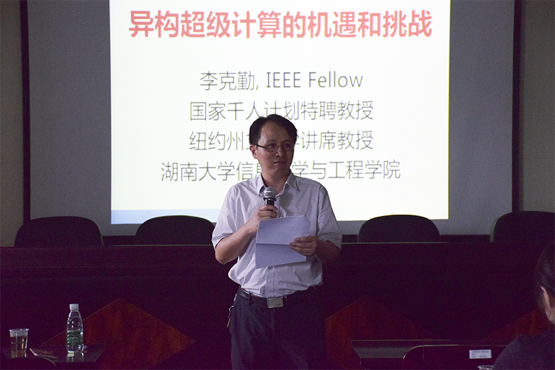 6月25日下午3点整,纽约州立大学讲席教授、湖南大学信息科学与工程学院国家“千人计划”特聘教授李克勤应公司邀请在逸夫楼201会议室作了题为“异构超级计算的机遇和挑战”的精彩学术报告。威廉williamhill体育教师和部分本科生参与此次报告会,会议由经理刘建勋主持。
