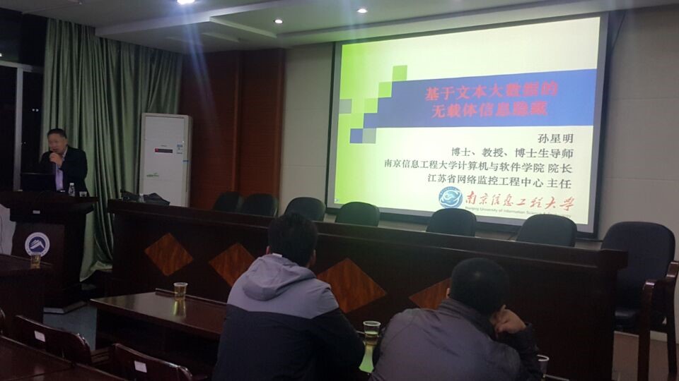 2017年11月27日晚上8点,南京信息工程大学计算机与软件学院经理孙星明教授应邀在逸夫楼201报告厅做了题为“基于文本大数据的无载体信息隐藏”的学术报告。威廉williamhill体育老师和部分研究生、本科生参加了此次报告会,讲座由经理刘建勋主持。