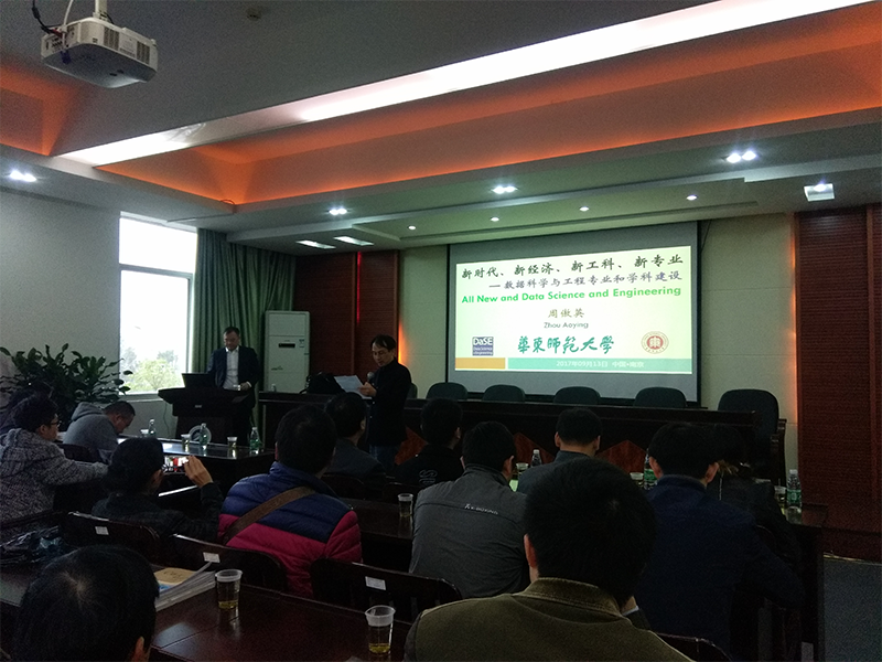 在报告会上,周教授通过百度、阿里巴巴、腾讯、滴滴、摩拜、OFO等互联网公司的商业模式及公司发展经历向我们介绍了“互联网改变世界”、“互联催生新经济”和“数据是新动能(Data is a New Power)”等观点的具体理解。通过Uber、Airbnb等实例分析了分享经济所带来的社会和技术变革。结合AlphaGo与人机大战讲解什么叫人工智能,及如何看待AlphaGo的出现对世界产生的影响,并深入讲解了区块链、大数据、互联网+的本质。在这个新经济蓬勃发展的时代,人工智能推动了产业升级,也意味着信息技术发展范式发生了变化:应用驱动创新、开源加速创新、硬件助力创新。新经济需要新型的人才,结合我国正在开展的新工科建设计划, 基于五年多来的实践和思考,介绍了在华东师范大学创办数据学院和数据专业的初衷。许多师生表示,此次讲座让他们对大数据有了更全面和更深入的认识,也激发了他们对大数据技术的研究兴趣。