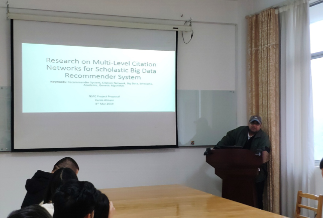 报告伊始,Karim 首先对学术推荐系统做了简单的介绍,而后提出了多级引文网络推荐系统的思想,并详细介绍学术大数据多层次引文网络推荐系统的设计方案。Karim 提到,考虑到数据挖掘、知识提取、书目分析、推荐系统等各方面需求的新挑战以及系统的准确性和效率,该项研究可以有效识别用户需求,并相应地过滤冗余信息。Karim 还提到在设计过程中添加的“元知识”库,有助于系统在不同的兴趣领域之间建立联系,促使跨领域的知识交流,做出更好的科学贡献。Karim在此次报告中发表了独到的见解,内容丰富,开拓了在场师生的学术视野。