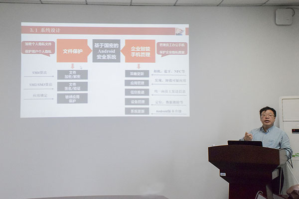紧接着,郑东教授进行了题为“基于国密算法的 Android 终端安全系统设计”的学术报告。郑东通过专业的学术知识及数据对Android系统进行了简单介绍。他依次分析了移动终端安全漏洞、移动终端隐私保护机制与应用部件控制、移动终端远程管理等方面内容。报告过程中,郑东通过展示员工的研究成果和现下新款特制手机讲述了手机存在的巨大隐私安全问题,在座师生深受启发。